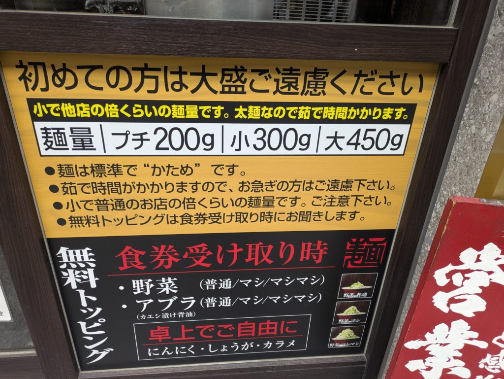 お店の外には早速二郎系名物の麺量に関する注意書きと警告が。さすが二郎系。小の時点で大盛りの麺量。しかもこれに山盛りの野菜と背脂がかかります。