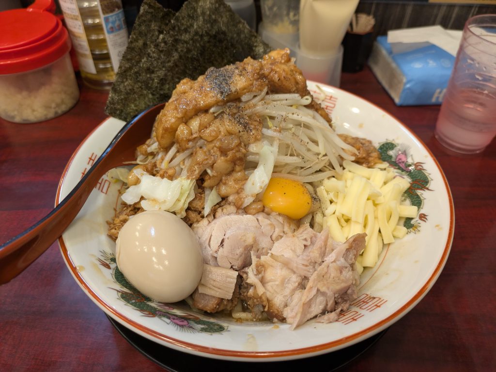 でかい。二郎系でそもそもやばいのに、更に味が濃くなるであろう油そば。しかもチーズにマシマシの背脂、野菜マシ、味卵とチャーシュー2枚付き。全卵もある。