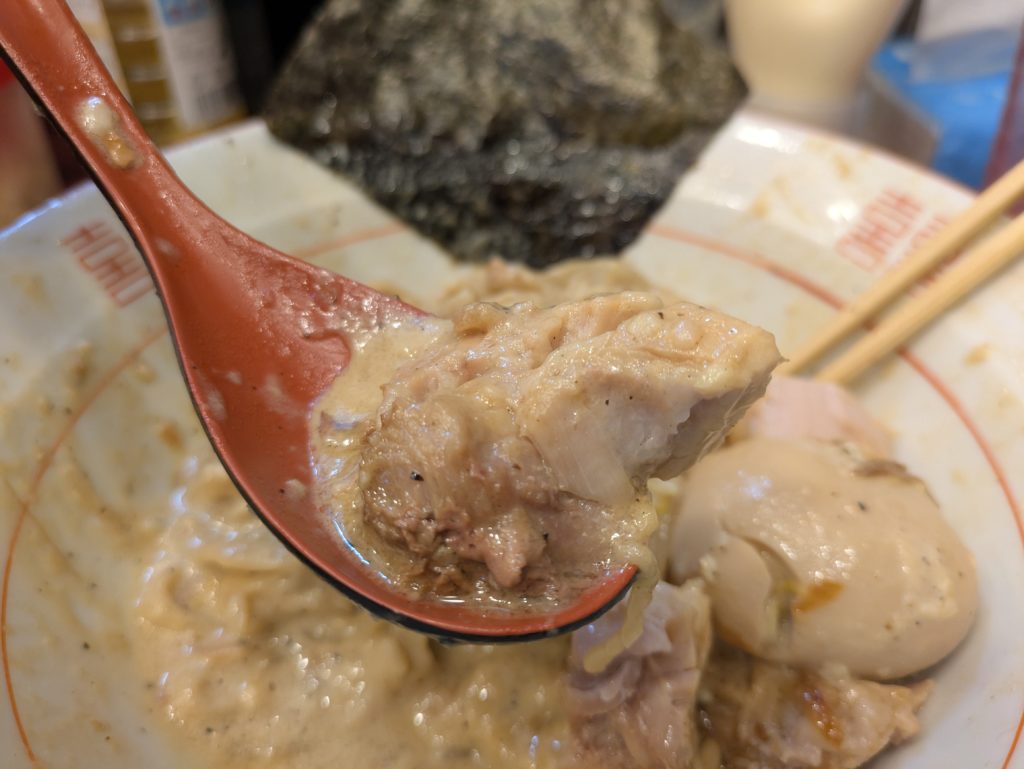 チャーシューはとろとろ。味たまは固めの半熟と素晴らしい出来なのですが、実は激烈に味が濃いです。しかも終盤に差し掛かり額に脂汗をにじませている状態でこれを食うのは至難の業です。