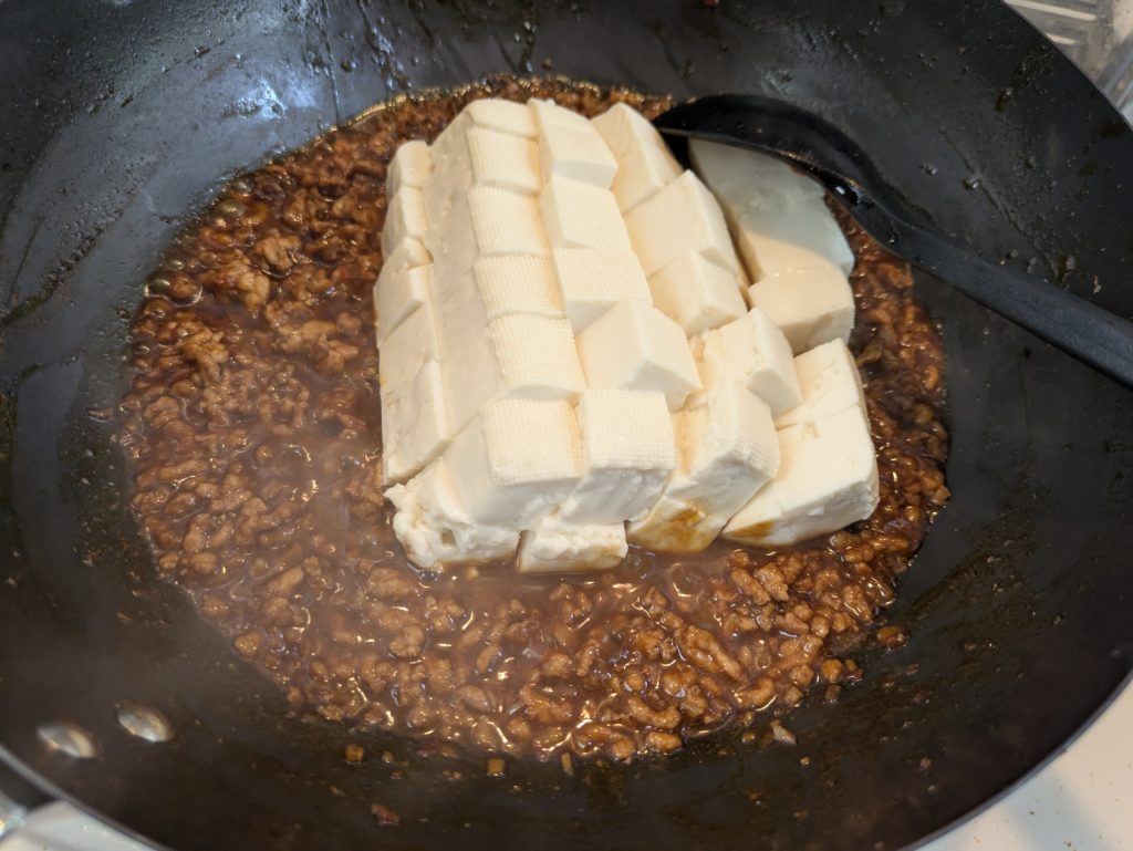 - さいの目に切った豆腐を加えて5分くらい中火で炒めます。