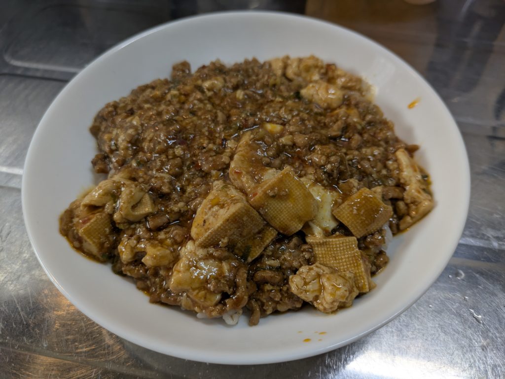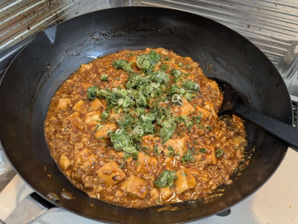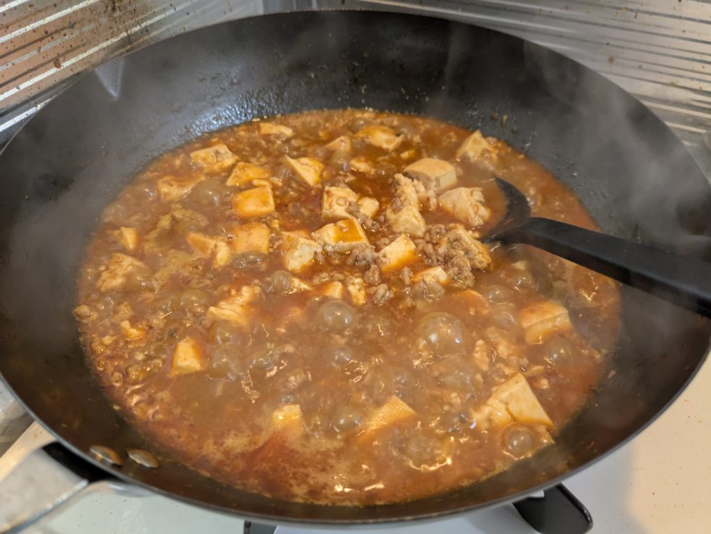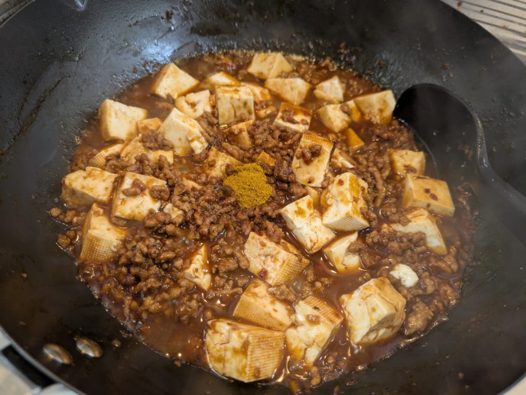 程よい辛さと多数の調味料がもたらす奥深い味、でもスパイシーでごまが効いている。みりんのお陰で何故か馴染み深いようにも感じる麻婆豆腐の完成です。