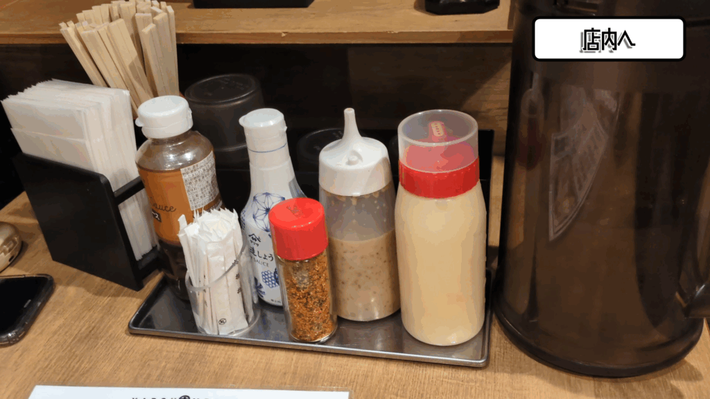 卓上調味料は左からソース、しょうゆ、七味唐辛子、ごまドレッシング、マヨネーズだ。