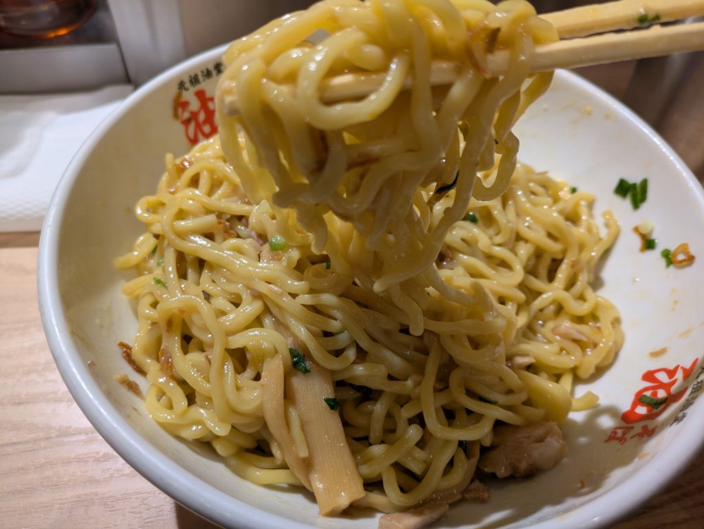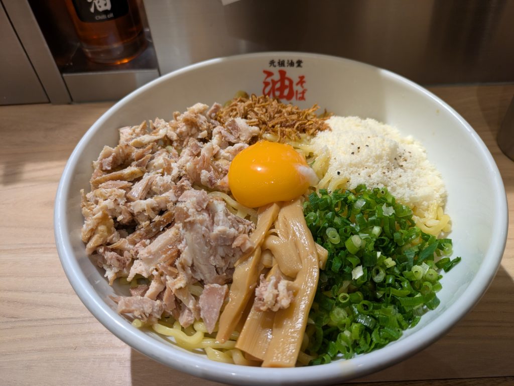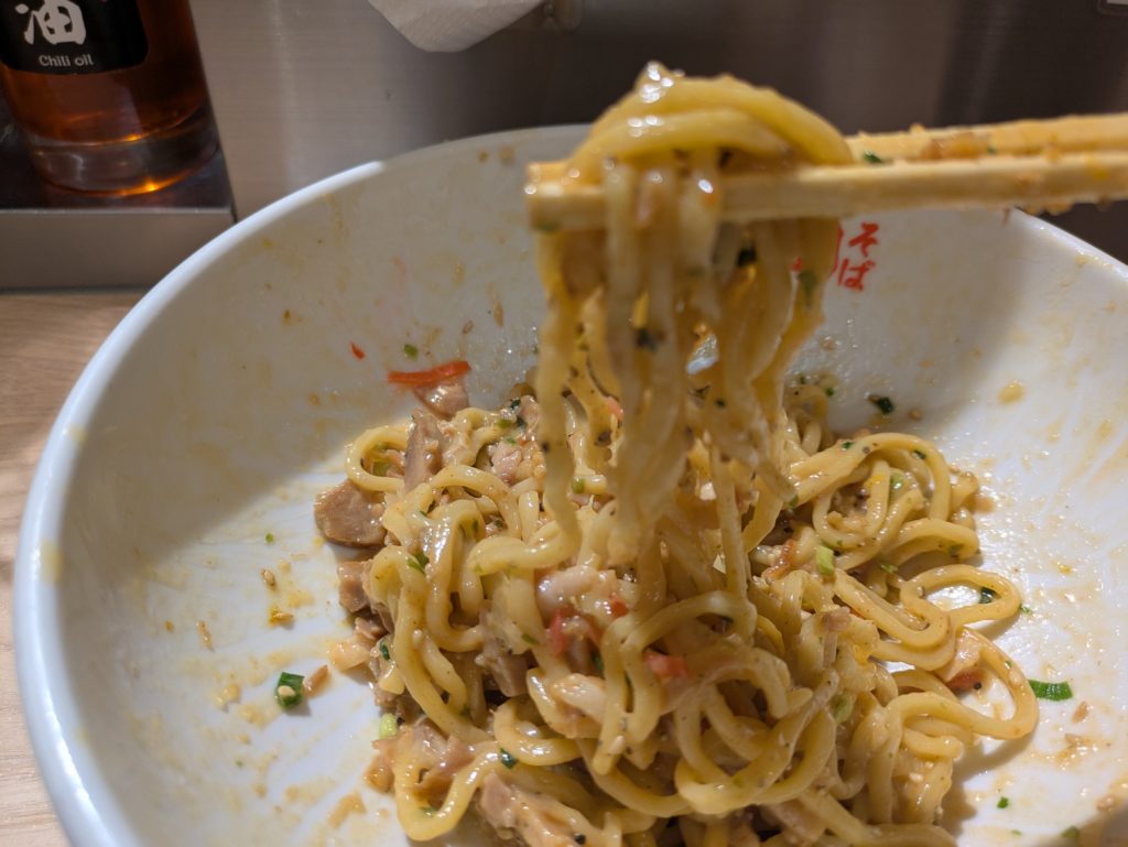 強烈なパンチ、風味、ジャンキーさが足され、油そばとしての本領を発揮します。