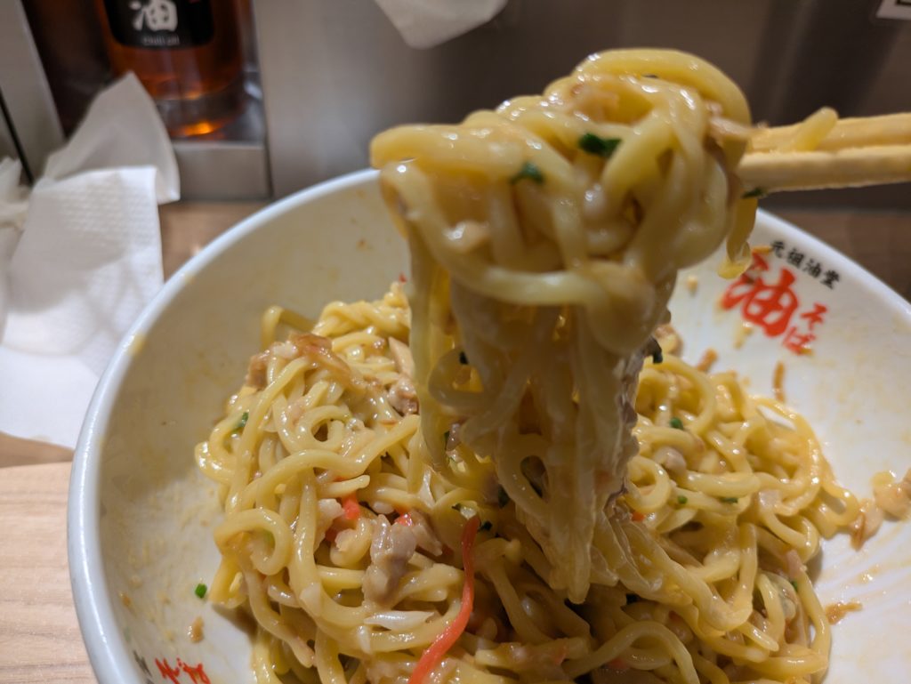 油そばの専門店。日本全国のみならず、韓国のソウルにも出店しています。麺はパスタ粉をブレンドし、8年かけて開発した特製麺を使用しているとのこと。